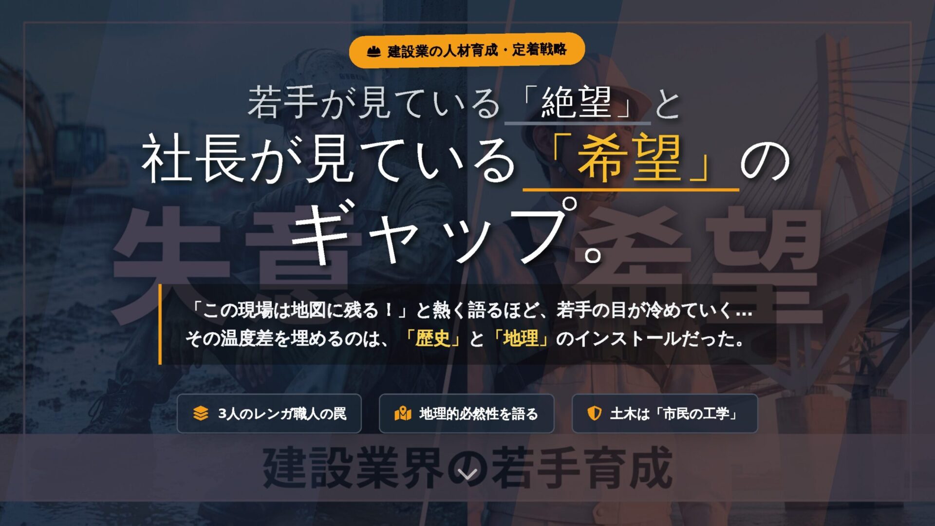 社長、あなたの脳内には「完成した立派な構造物」や「感謝する住民の笑顔」という【希望】が見えています。しかし、経験の浅い若手の視界にあるのは、終わりの見えない泥運び、鳴り止まない騒音、そして先輩からの怒声という【絶望(徒労感)】だけなのです。