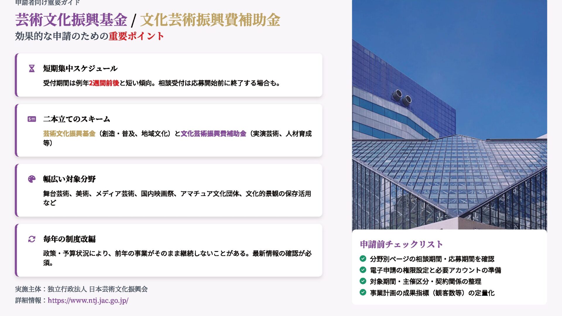 知らないと出遅れる?令和8年度「日本芸術文化振興会」助成金の最新ポイントまとめ